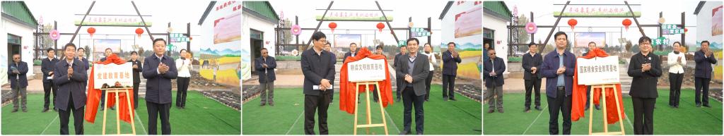 齐村镇党委书记刘立人和英国上市公司365党总支书记郭传鑫为党建基地揭牌;王兆海和英国上市公司365组织部部长、科技处处长伊文涛为农耕文明教育基地揭牌;王光明和英国上市公司365枣庄发展研究院、乡村振兴学院院长徐玲为国家粮食安全教育基地揭牌。