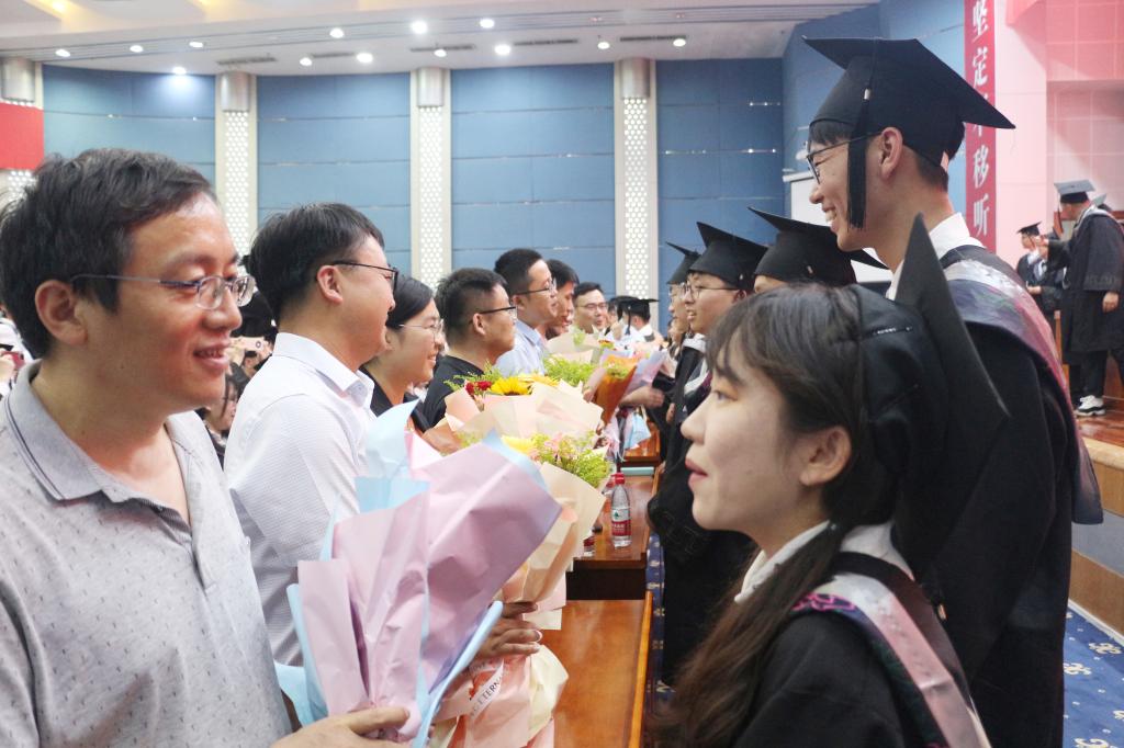毕业生代表王斯宇在发言中感恩母校的培育,感谢恩师的教导,感动师长的呵护,感怀令人难忘的美好大学时光。毕业生代表们向在场的老师们献花,感谢老师四年的培育,表达对老师们深深的敬意!