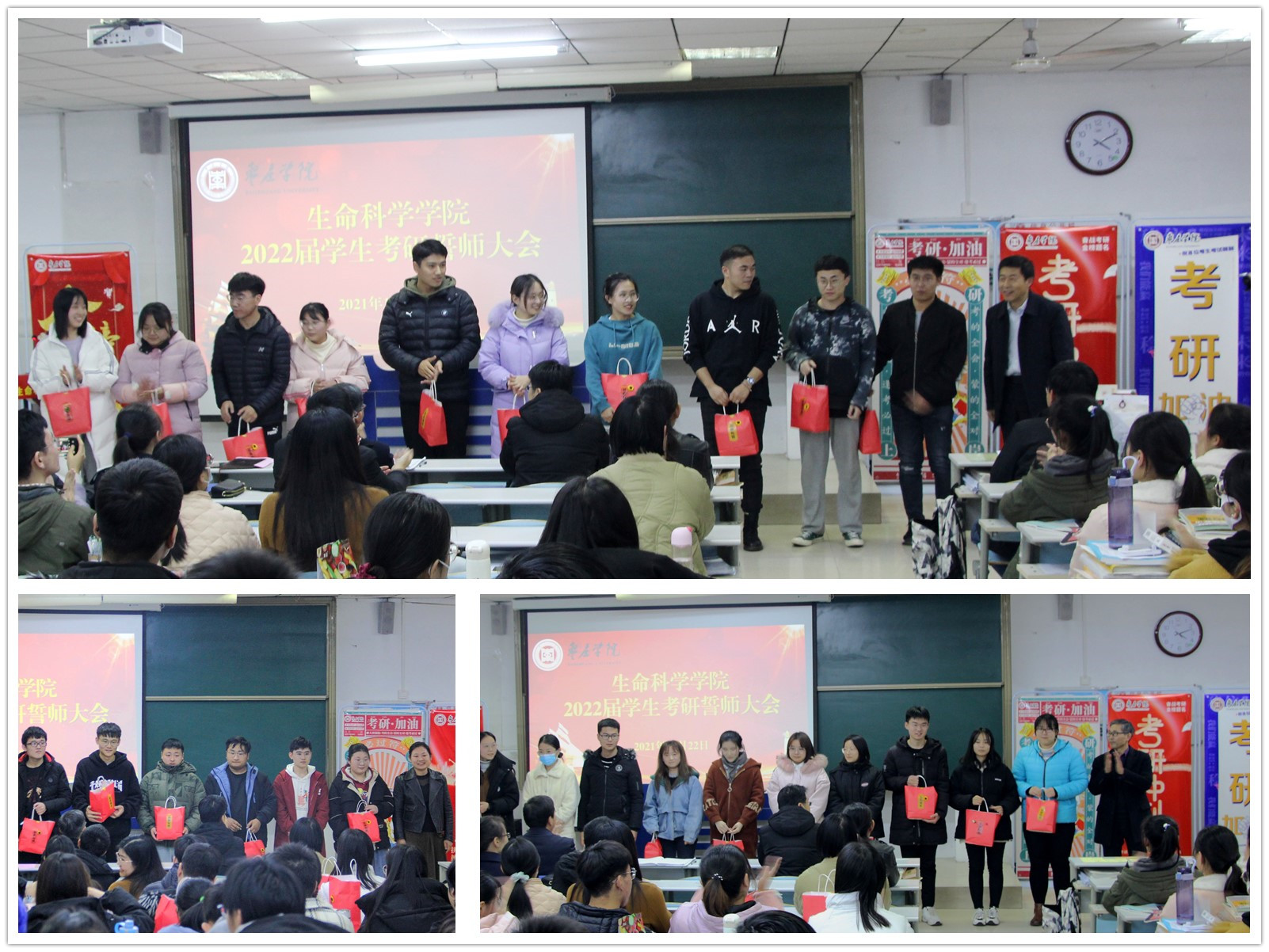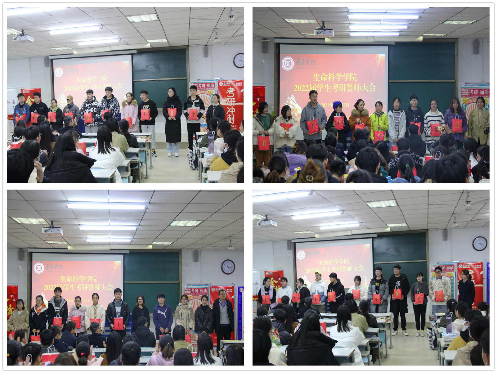 在充满温情的歌声中,一组组考研学子上台接受领导老师们赠送的“金榜题名加油包”,满满的红色福袋里有防疫物资、面包牛奶、还有镌刻每个人名字和寄语的定制可乐。相信这份深情的寄托,在寒冷的冬日里能给考研学子们送上“最温暖”的祝福。