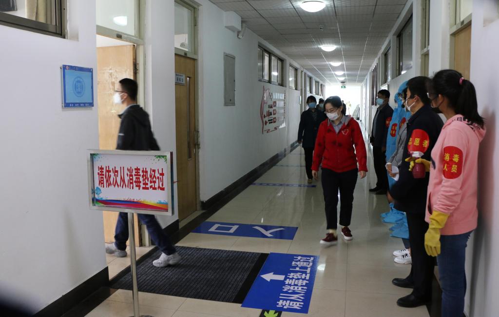 本次演练分为两个环节:第一个环节为应急演练。在“课堂教学场景应急演练”中,由教职工志愿者扮演的“员工”间隔两米,依次经过消毒垫进入教室,并按照安全距离在指定座位就坐。上课过程中有“员工”突然出现身体不适、咳嗽情况后,举手报告任课员工,任课员工立即电话通知学院联络员。随后联络员采取五步工作法:场地联络员赶到现场处置,送达该“员工”到临时留观点后返回教室对其他“员工”进行心理辅导,随后指挥“员工”依次离开教室回到宿舍,然后由消毒员对教室进行重新消毒。在“宿舍场景应急演练”中,宿舍有“员工”出现体温异常后,立即向学院值班干部汇报,值班干部立即联系联络员,场地联络员、学院转诊员及学校医务人员,随即启动突发疫情应急处置程序。场地联络员对该宿舍其他三名“员工”进行现场登记,消毒员对该生宿舍和通道进行消毒。