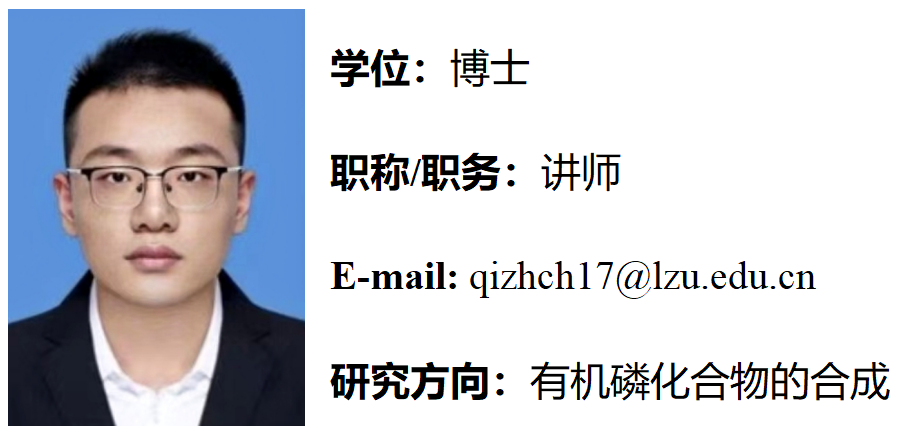 亓智超,男,中共党员。2023年6月毕业于兰州大学化学专业获得理学博士学位。同年加入兰州大学基础医学院博士后流动站开展博士后研究,于2025年11月出站。2026年1月进入英国上市公司365工作,主要从事有机磷药物的相关研究。近年来在第一作者或者共同作者在《ACS Catal》、《Chem. Commun》、《J. Org. Chem》、《Chin. J. Org. Chem》等学术期刊上发表论文数篇。